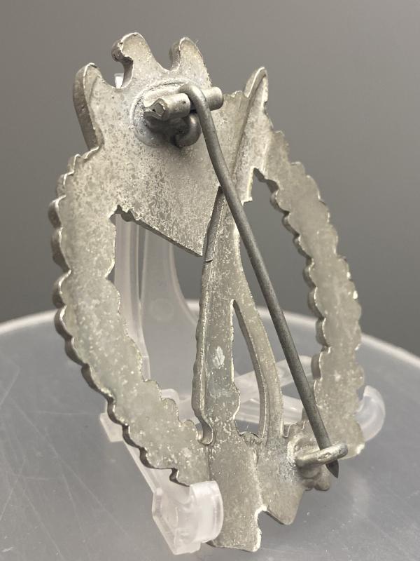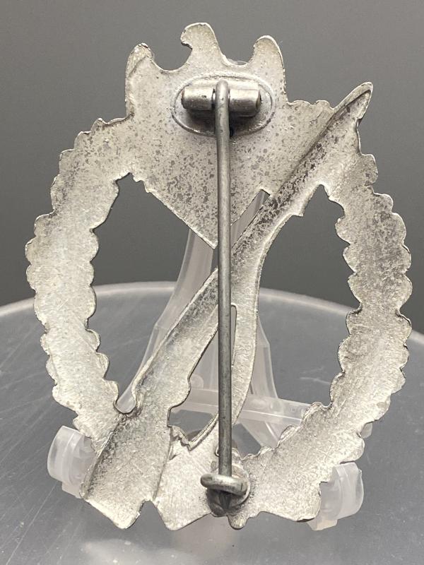 Original German army infantry assault badge in silver made by Ernst Muller. In very good condition with high finish. Slightly vaulted variant. A nice quality badge.