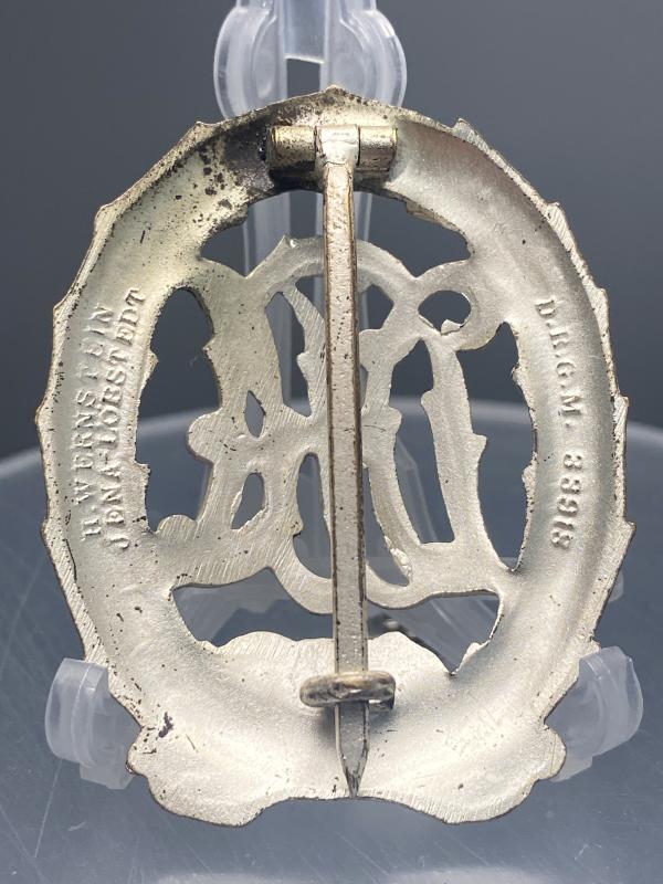 Original pre war German DRA Silver sports badge manufactured by Hermann Wernstein of Jena. Very high amount of original finish present on the award.