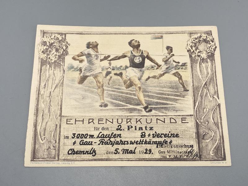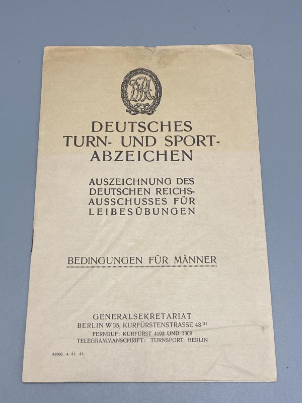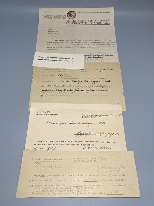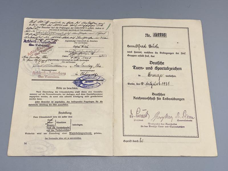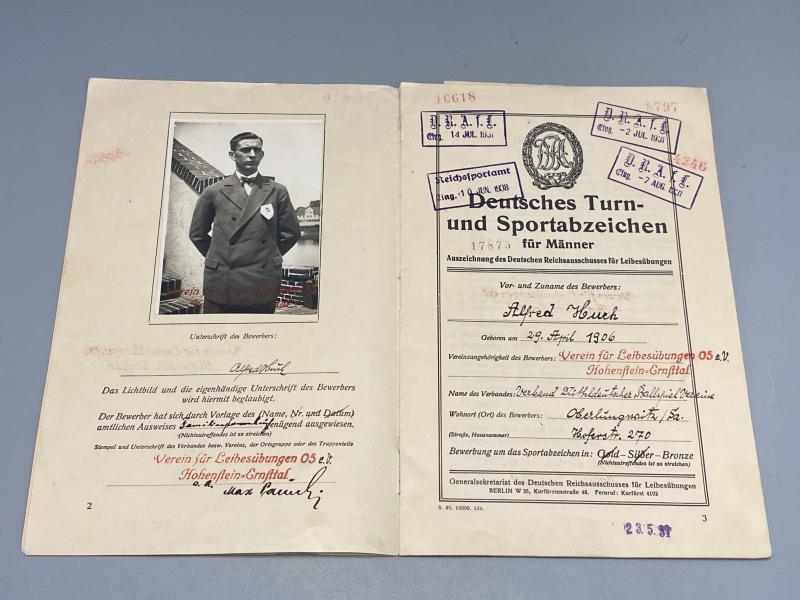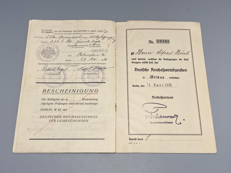 Original pre war grouping of sports badge paperwork to Alfred Huch. Included is his main Sports badge book which tallied his achievements towards earning the award. He earned both the Bronze and silver grade. A certificate for a 3000m run, five assorted pieces of paperwork relating to his training and also the guide book of the sports badge. A nice complete group.