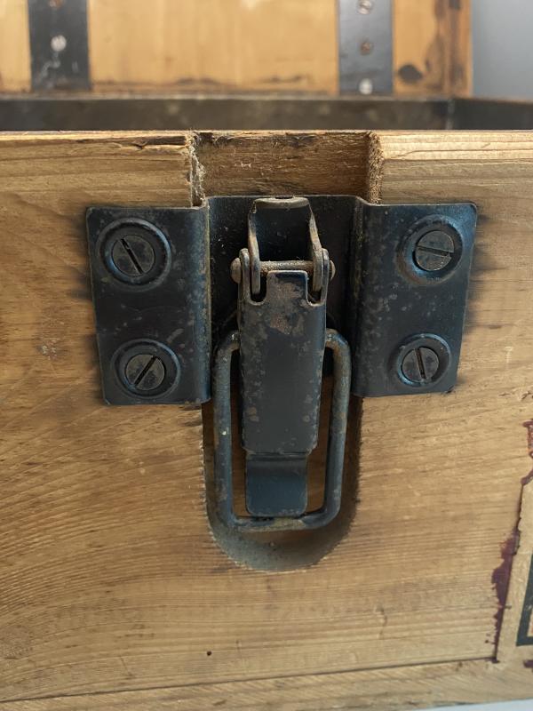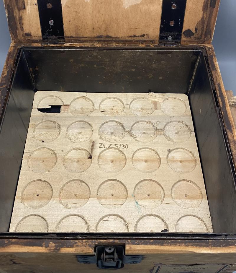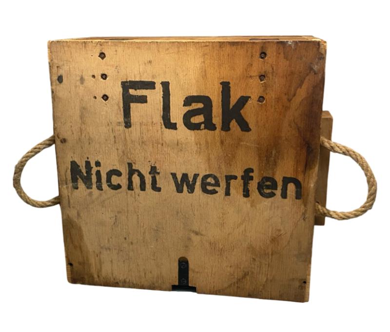German Army/ Airforce Flak Artillery wooden crate for Fuse heads. Comes complete with metal casing and wooden tray to lay each piece. Some minor chips to this wood however nothing too serious. Nice clear stencilling on the front. Paper label present on the side of the crate as well as inside. Nice clearly marked 41 with the three letter factory code. Both rope handles in good shape as well at the metal latch.