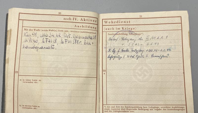 Heimann was promoted during his time in the SS first beginning as Oberkannonier and later Sturmann. He had a vast amount of training on multiple weapons and was proven very efficient with Artillery as noted by his Sturmbahnfuhrer. Heimann completed weapons training with the K98K rifle, MG34 & 42, MP40, 7,5cm Artillery Gun and another gun which I do not recognise.
