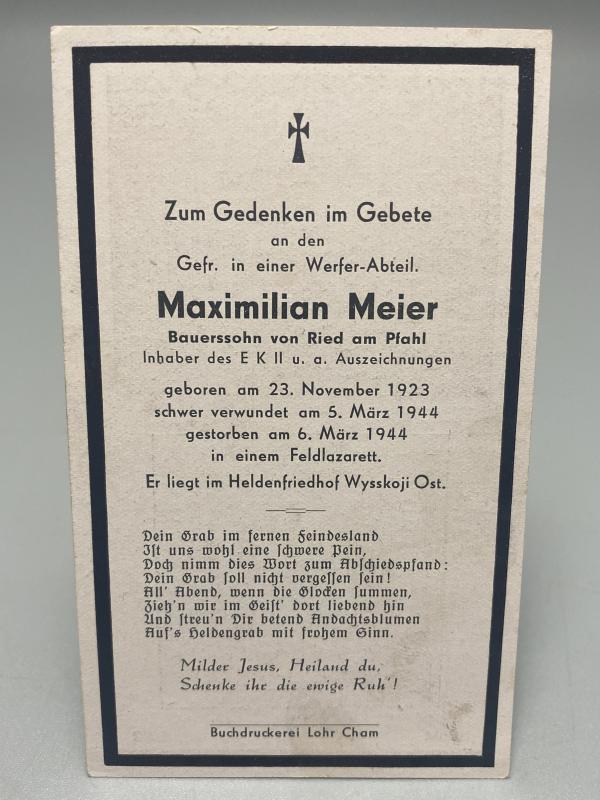 German Army Death Card Maximilian Meyer Mortar Crewman Eastern Front 1944