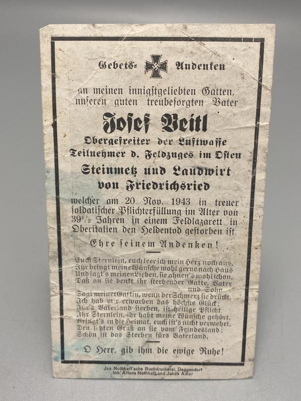 German Airforce Death Card Josef Beitl Died at Field Hospital North Italy 1943