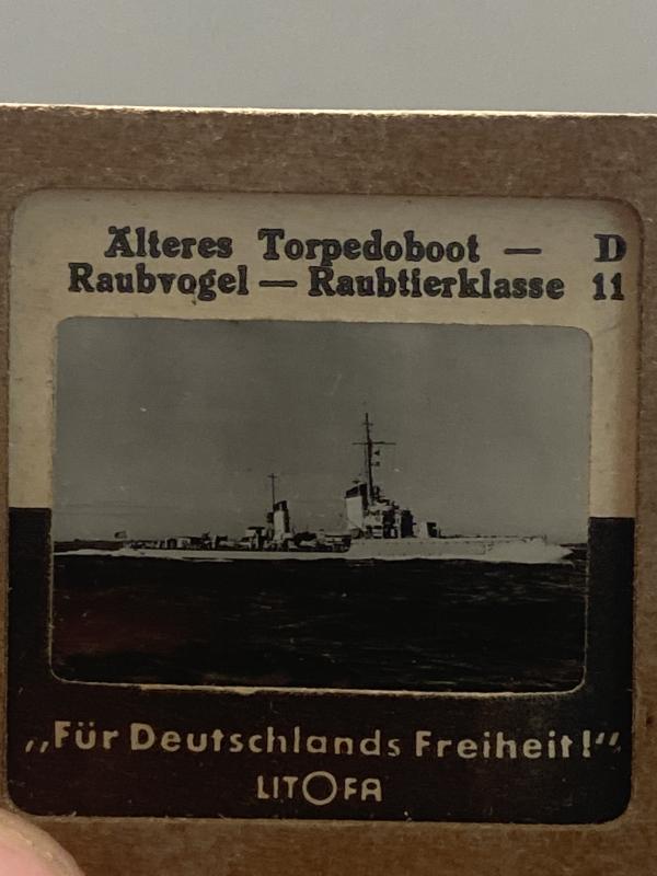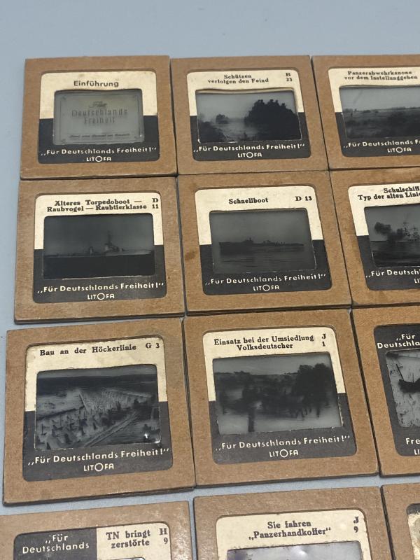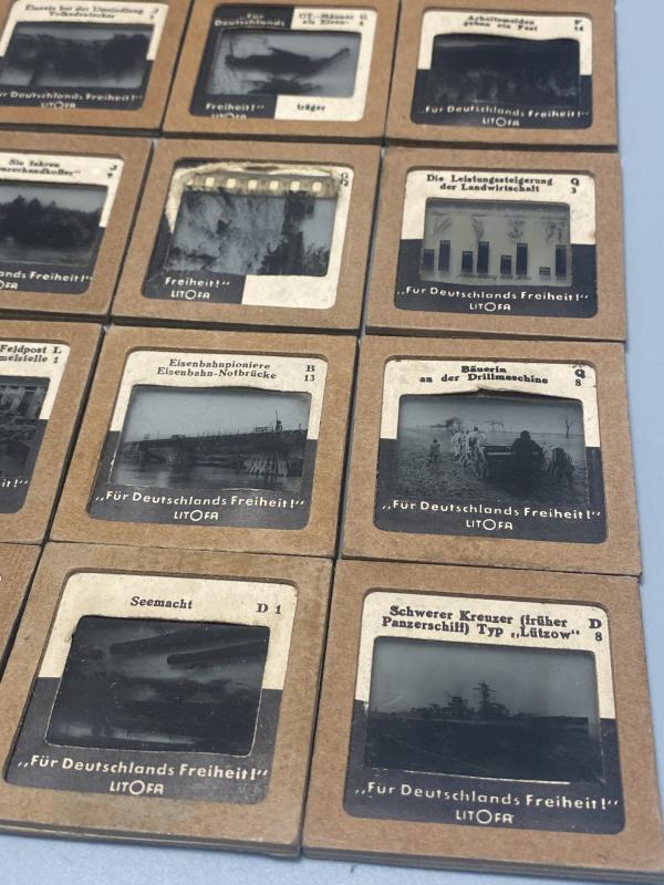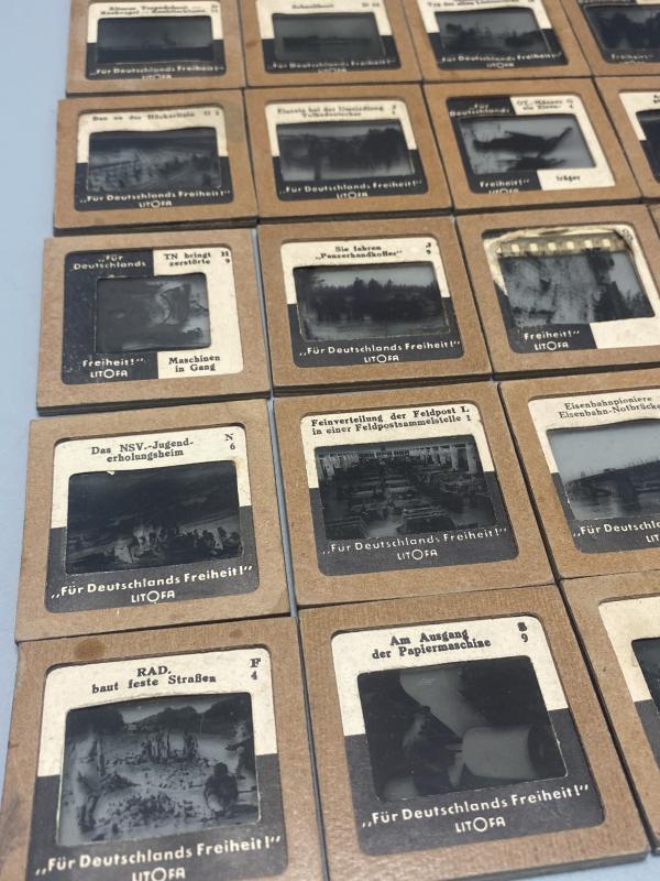 Original group of 24 projector slides named “Für Deutschlands Freiheit!” Manufactured by Litofa. Each projector slide has a different image and title. From home front factories to military campaigns. A nice group.