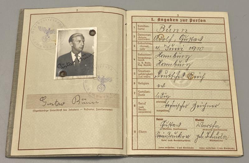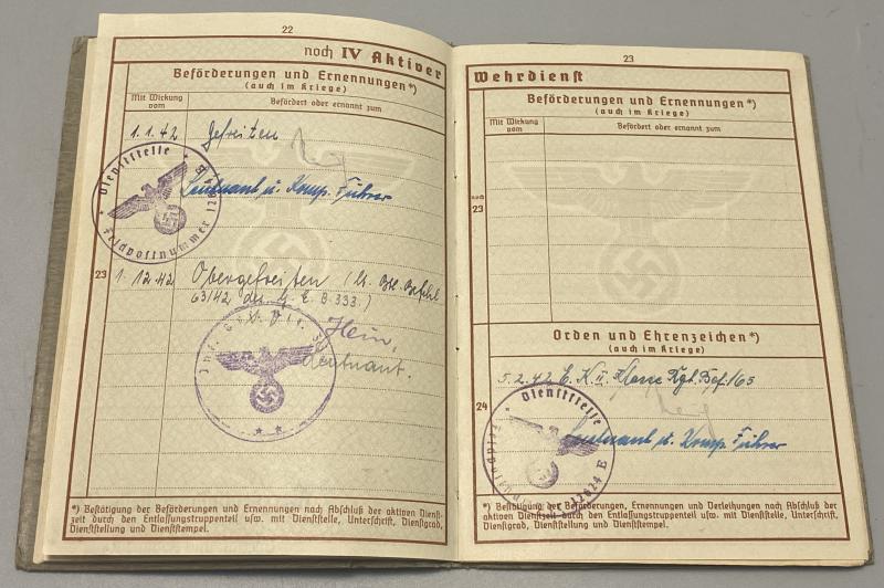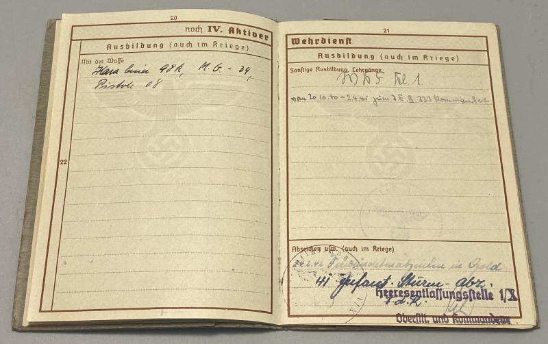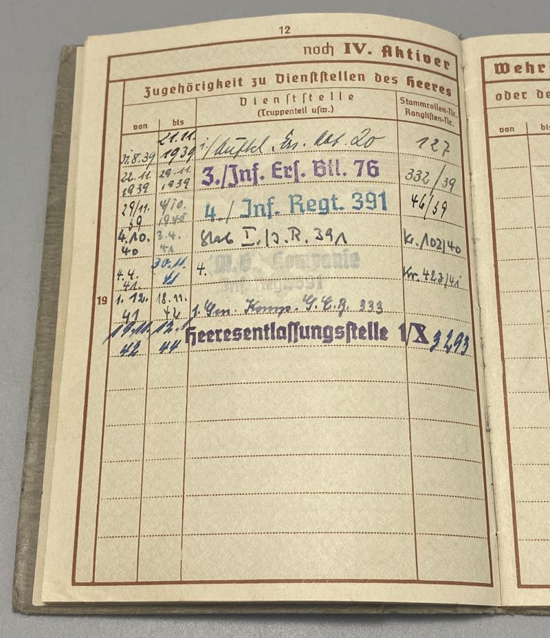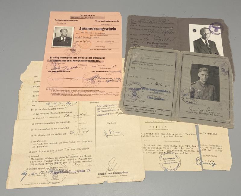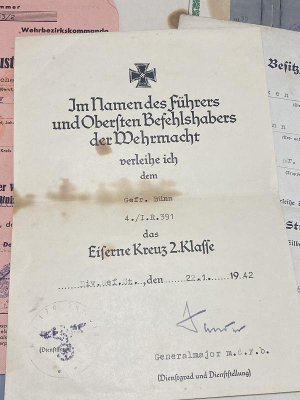 Original German army grouping belonging to Obergefreiter Gustav Bünn. Born 4th June 1910 in Hamburg, Bünn joined the army in 1938 and was attached to 3rd Battalion Infantry Ersatz Battalion 76. His first combat experience was the battle of france with Infantry Regiment 391 (the unit he remained with for the rest of his service). He was regular infantry and also trained on machine guns when with the 4th MG Kompanie of the regiment. His weapons training alongside the K98k was the MG34 and P08 pistol. Bünn in 1941 was with the 170th Infantry division taking part in operation Barbarossa. He was awarded the Infantry Assault Badge in Silver and Iron Cross Second class. His citations for these awards are included. The Iron cross certificate is signed by the divisional commander, Generalmajor Erwin Sander (KC holder). Bünn was severely injured in 1942 and recieved the wound badge in gold. This citation is present with the wehrpass as well. Bünn had a long recovery but was no longer fit for service and was discharged on the 30th June 1944. His discharge certificate is present. Bünn’s Army and civilian drivers licenses or “Fuhrerschein” are included. A lovely group with a prestigious citation. His wehrpass lists all the awards as well as his combat history.