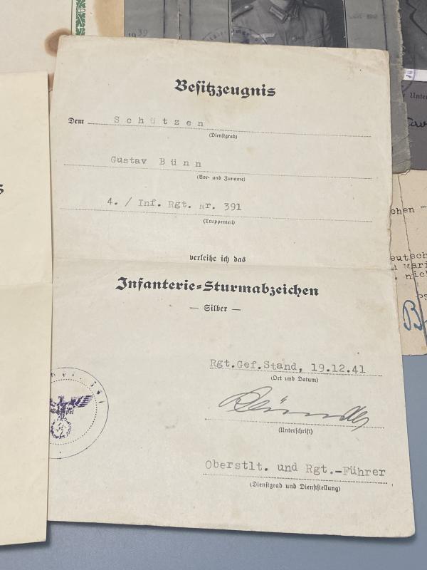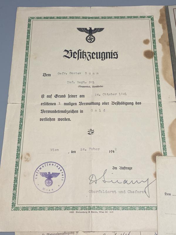 German Army Wehrpass & Citation Group Gustav Bünn Wound Badge In Gold Inf.Regt.391 170th Infantry Division
