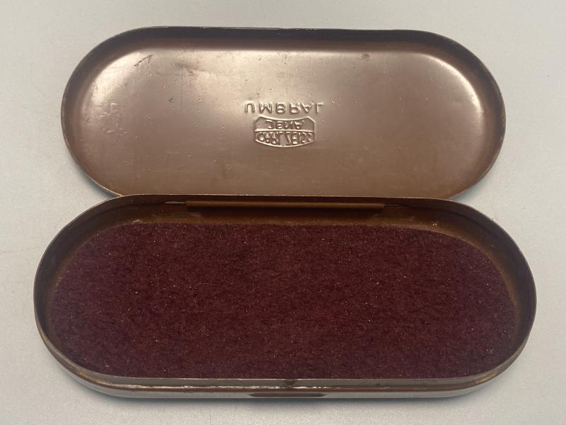 Original German army sunglasses case made by Carl Zeiss. Tin case with brown paint finish. In good condition.