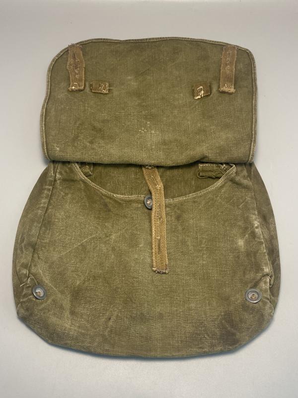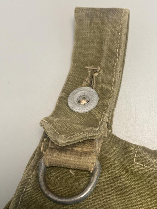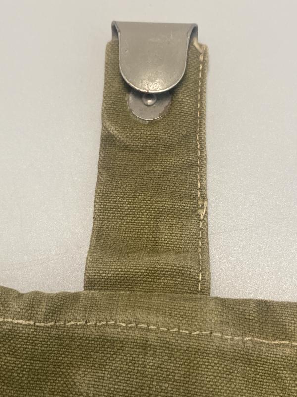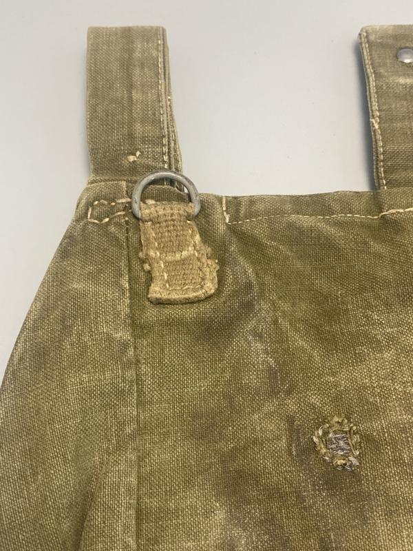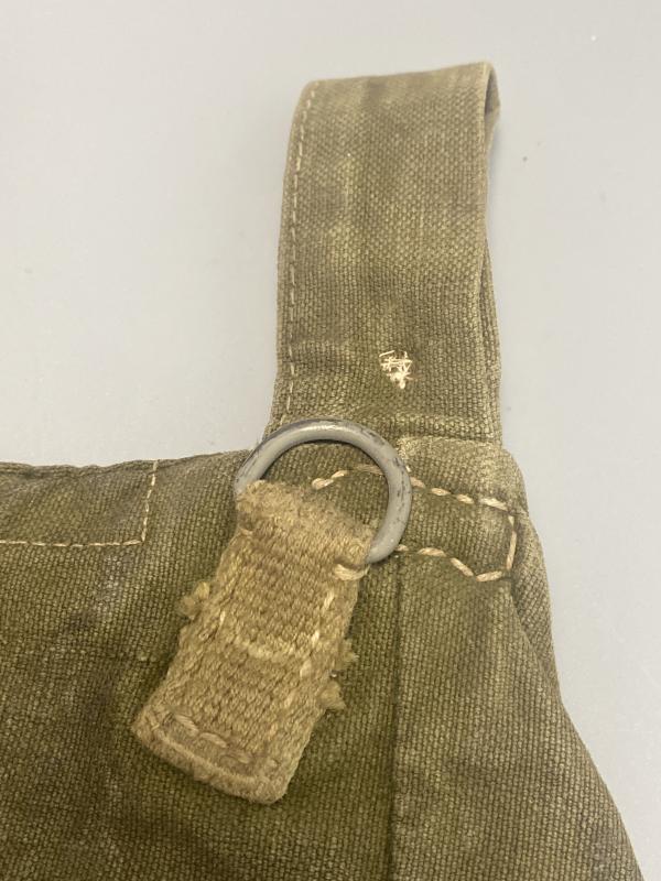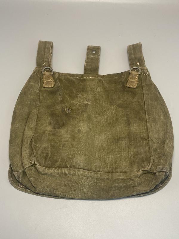 Original Herman army bread bag as used by the Afrikakorps. Canvas construction with webbing and grey painted metal fittings. No stamps visible. In field used condition. One small hole in the back, no further damage or repairs.