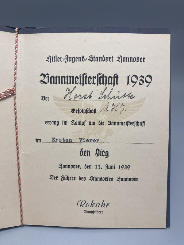 Original HJ issued Bannmeisterschaft 1939 award booklet. In embossed paper cover.