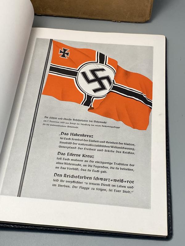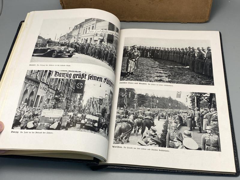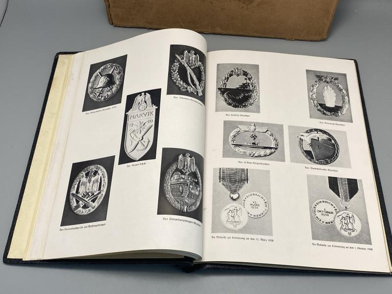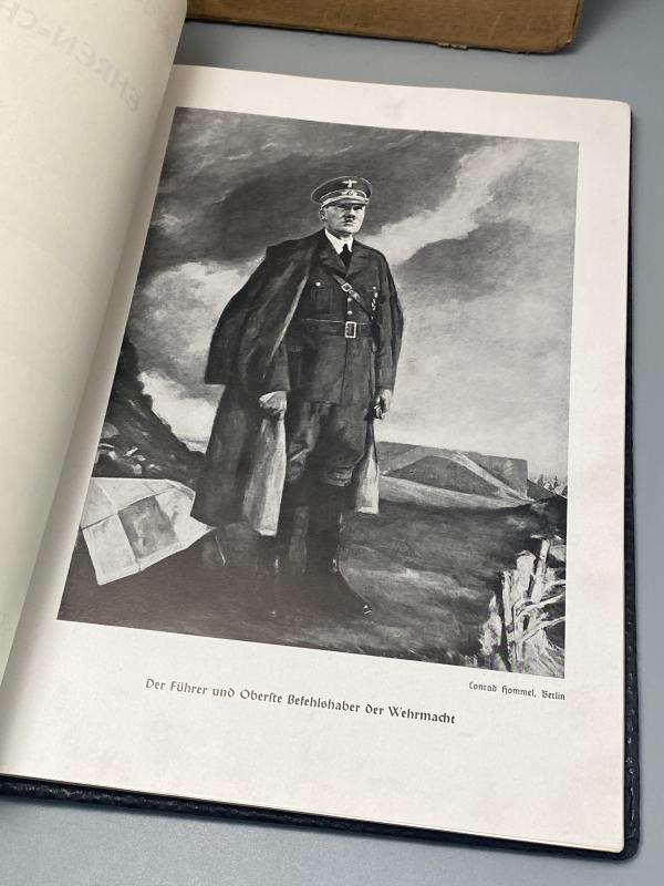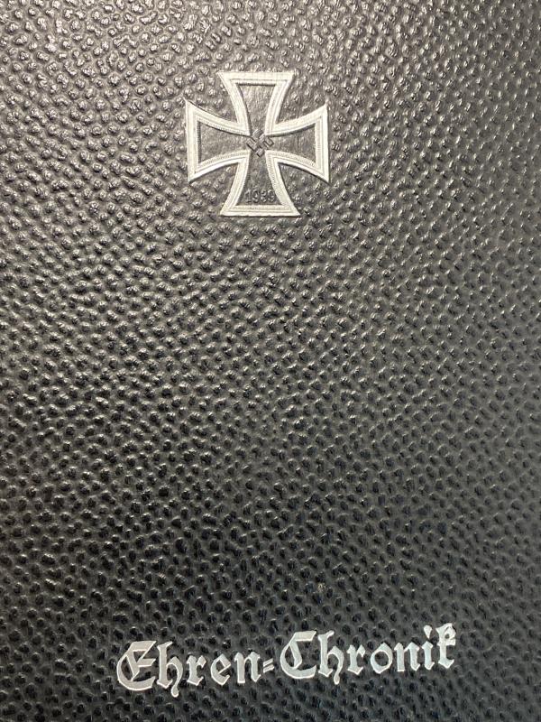 Original NSKOV issued Kriegs Chronik for August Mosel who was killed on the 20th April 1942. The article is in a leather binded folder with embossed Iron cross. First page in Gothic German explains his death and its date alongside the signature of the Gauamtleiter of Magdeburg. A photo of him is included where he wears his Waffenrock parade uniform with a chest full of medals including the Close Combat Clasp, Iron Cross First Class and Panzer Badge. The photo album part of the book has not been filled in by the family. Included with the book is the original box it came in with his address and post marks. A nice memento.