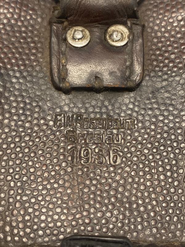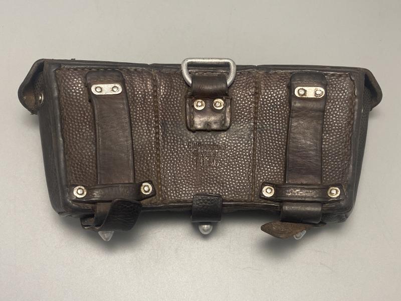 Original WW2 period K98K ammo pouch maker marked F.W.Rosenbaum of Breslau 1936. Brown leather dyed black. No internal dividers. Leather soft and supple.