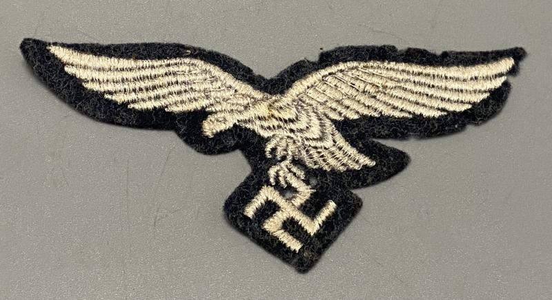 Original unissued Luftwaffe Enlisted man’s breast eagle. Embroidered on wool backing. Some minor moth nip.