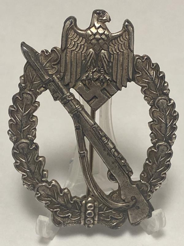 Original German Infantry Assault badge in silver manufactured by Schuco. Nice well made badge with high finish present. Complete with the original pin, hinge and hook.