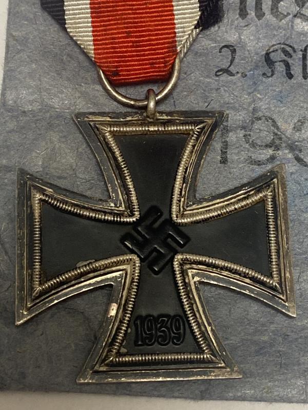 Original Iron Cross second class with ribbon complete with packet, produced by Richard Souval. A nice original pairing. Cross ring is unmarked however the award is produced by the factory.