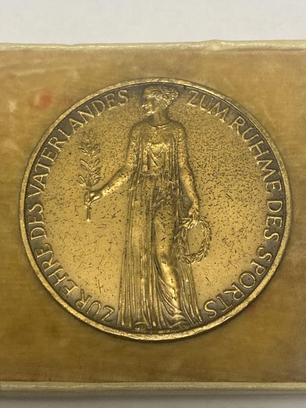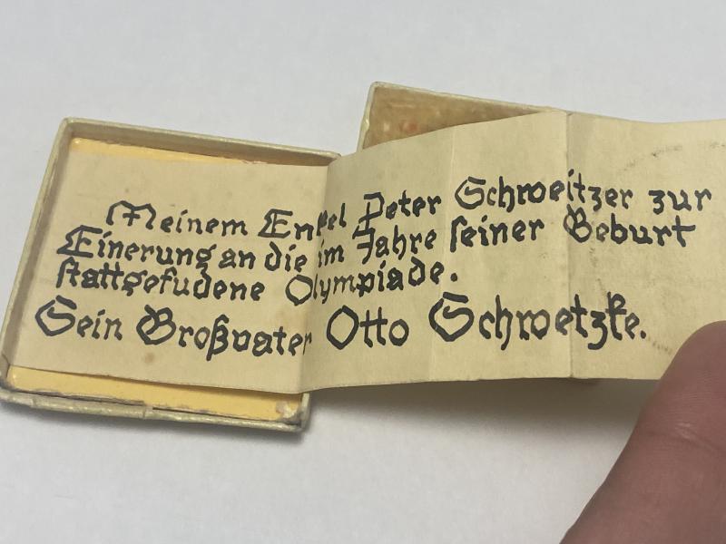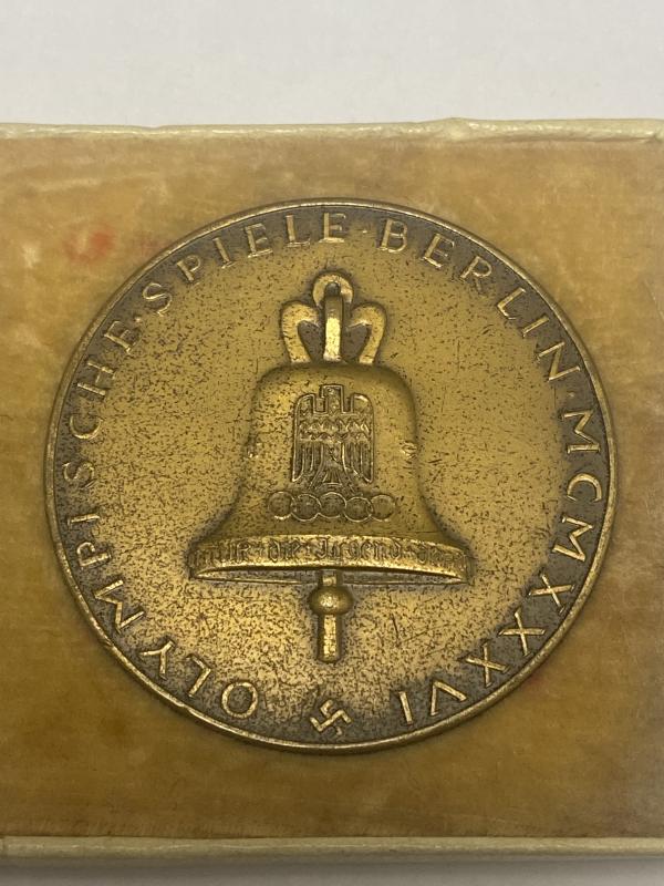 Original 1936 Berlin Olympics bronze medallion in box. Box contains a note inside from a grandfather who had given the medallion to his grandson as a reminder of the year he was born. A nice personal effect.