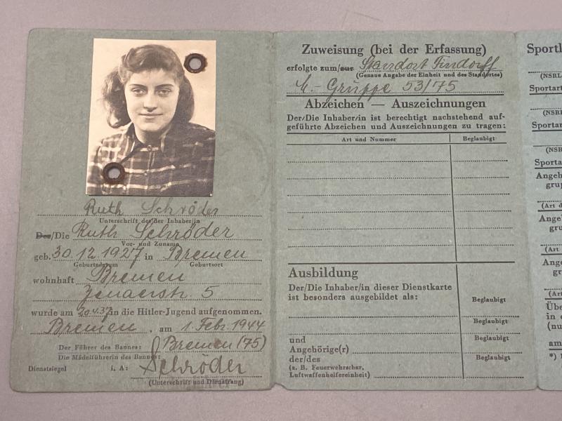 Third Reich BDM Female HJ Members Dienstkarte Ruth Schröder