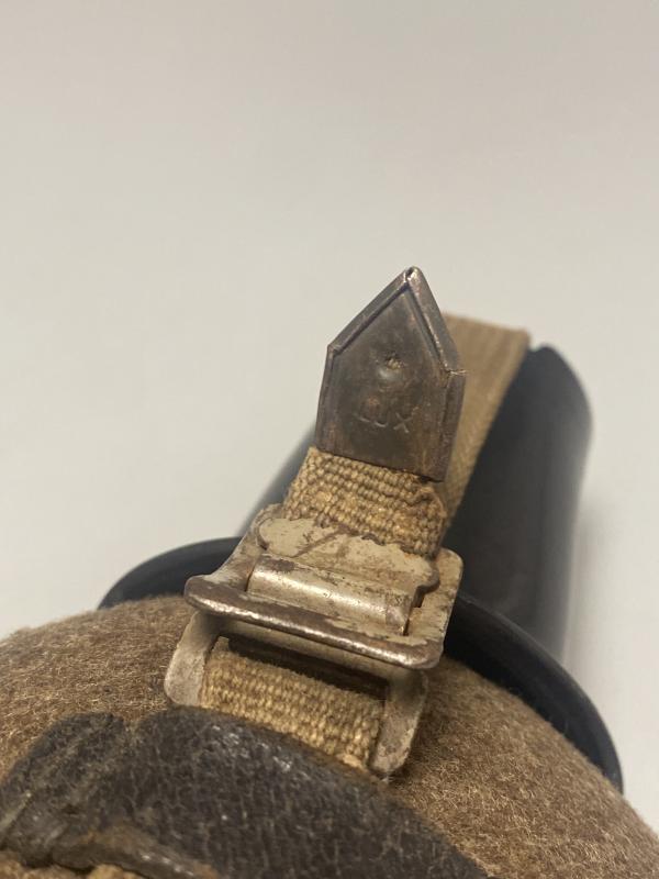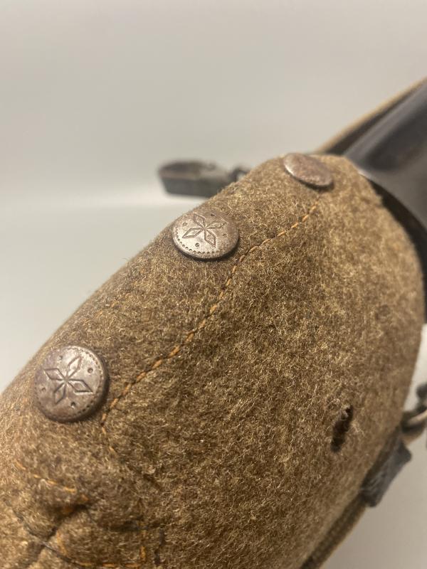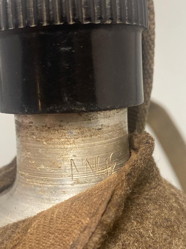Original German army water bottle consisting of the bottle, wool cover, canvas and leather strap and Bakerlite cup. Bottle and cover both marked MN42. Cup does not appear to be marked. In good condition. One or two minor moth nips on the wool. Leather remains soft and supple.