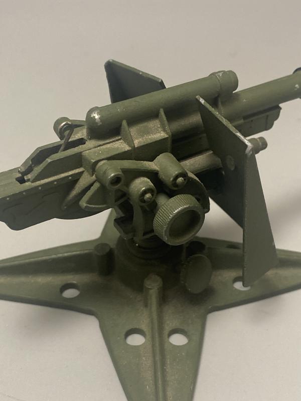 Nice vintage WW2 German Flak 88mm diecast model in full working order. Gun works on gears to go up and down and spins. Appears to fire pellets/ matchsticks. Likely dates to the 1960s. Base measures approx 13cm and when the model is elevated to its highest point it is approximately 15.5cm high.