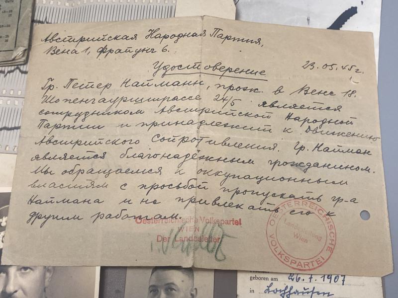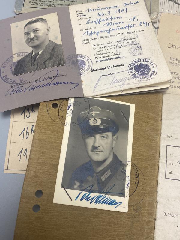 Original German Army Soldbuch to Gefreiter Peter Neumann of Stamm-Kompanie Landeschutz Ersatz Batallion 11/17 serving on the Eastern front. Soldbuch is a reissue as noted on page 1. Several hospital visits noted and Neumann was awarded the KVK2 in late 1944. Included with the Soldbuch are many other documents relating to the soldier including Gesundheitsbuch, immediate post war Austrian drivers license, a studio portrait photograph during wartime service and several other documents including a letter explaining he was in the resistance during the war years and demands he be returned to Austria from the Soviet Union where he was detained. The reverse of this letter is hand written in Russian. A nice lot worthy of more research.