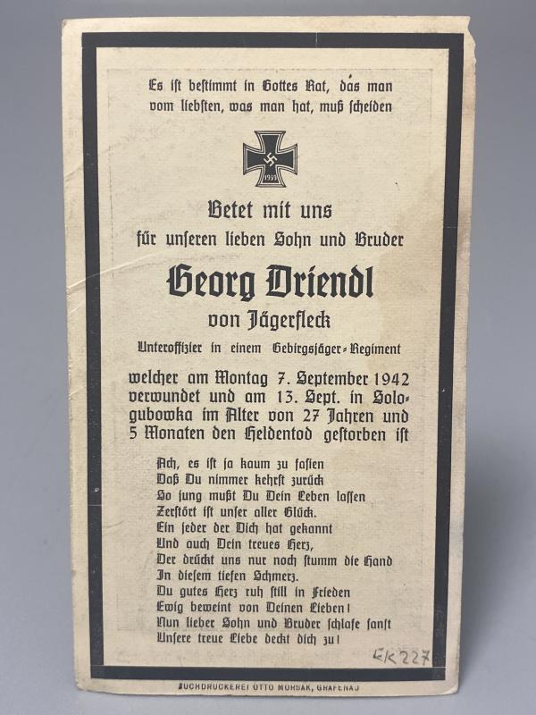 Original German army death card to Georg Driendl who was killed in action serving with a GJ unit in Russia 07/09/1942.