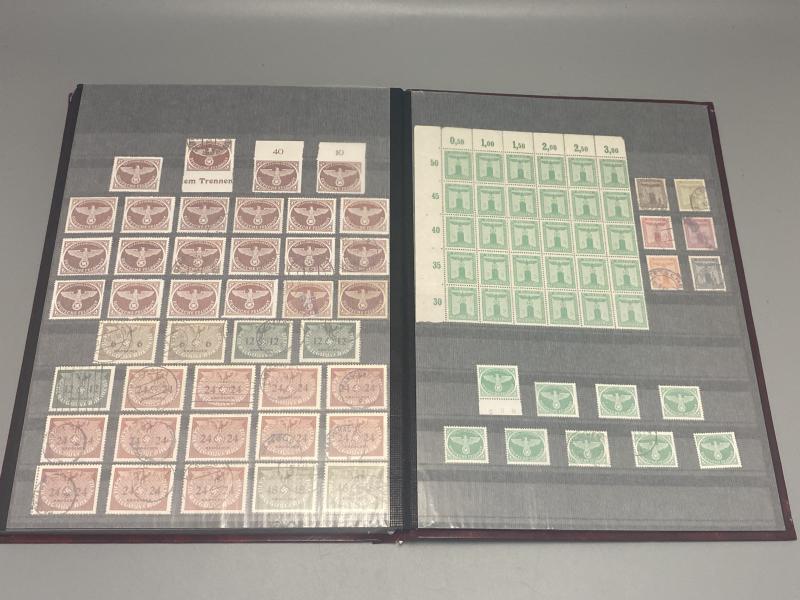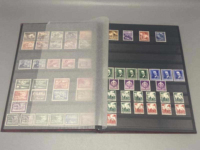 Large folder full of Third Reich period stamps. A mix of used and unused stamps. Some on original sheets and others removed from mail. 100s of different types from inside Germany and the extensive occupied territories. All neatly placed in the album. It is noteworthy that there is also a first day cover inside dating to 1937. Not all have been photographed, further photos can be provided on request. Over 1300 individual stamps.