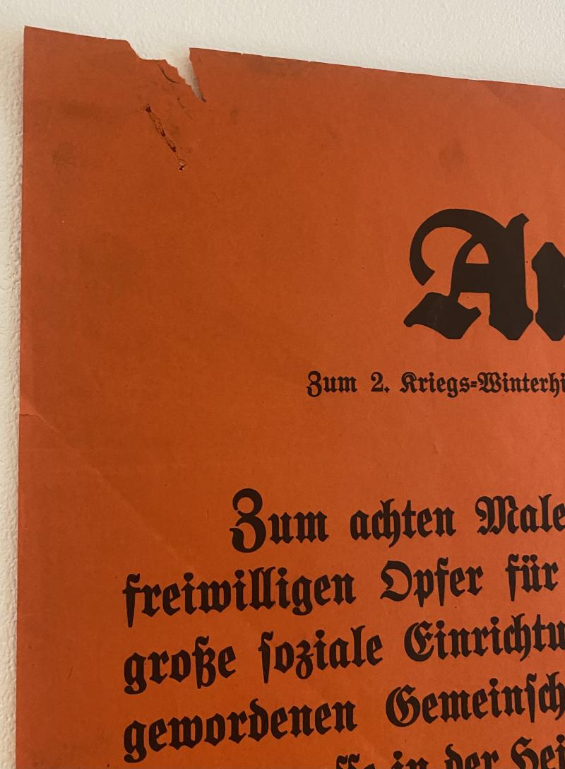 Original 1940/41 Winter Relief Fund appeal poster. Outlining a small financial contribution to the war effort is small compared to the sacrifices of the soldiers fighting in the frontlines. Issued by the propaganda department of Vienna on behalf of Adolf Hitler. Poster approx 61cm X 43cm. Printed on wafer thin paper. Nice original piece, some creases and small rips. Ideal for displaying in a frame. Poster will be recieved folded. Poster comes with a hand written accurate translation.