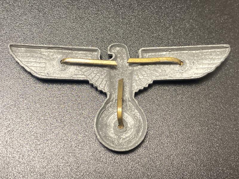 Original NSDAP Reichadler cap eagle maker marked M1/72 for Fritz Zimmermann. Eagle made of zinc with silver finish. A high proportion of this finish remains. All pins are present.