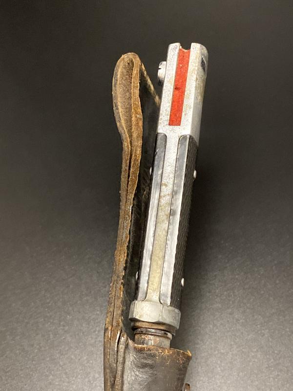 Original German K98K short parade bayonet manufactured by Krebs. Blade in very fine condition, some minor wear to the finish of the plating of the handle. Complete with scabbard and black leather frog. A nice example by a rare maker.