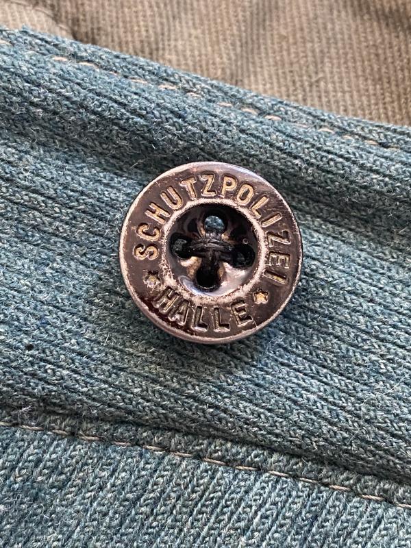Original WW2 period German “Schutzpolizei” Police straight leg trousers. Complete with all buttons. Made of grey green wool with orange piping. Well worn pair, without stamps present on the lining. Some moth nips present, notably around the groin area.