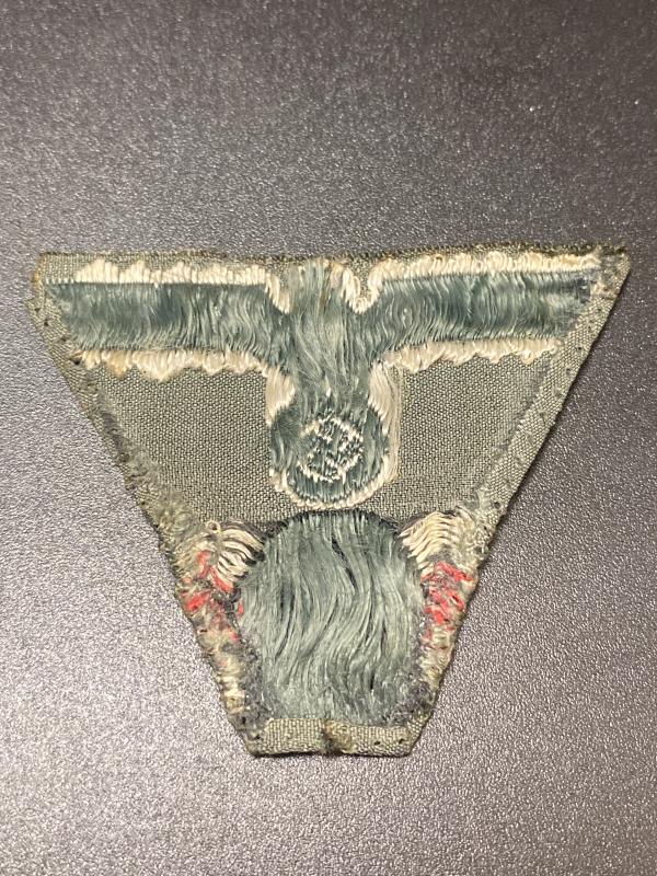 Original bevo woven trapezoid for the German army M43 field cap. This example has been removed from a cap with thread holes present around the edges.