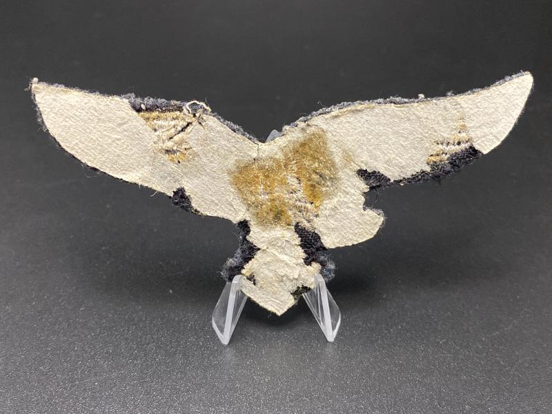 Original uniform removed Luftwaffe EM breast eagle. Paper on the back where it was once attached to a photo album. Embroidered eagle on blue wool.