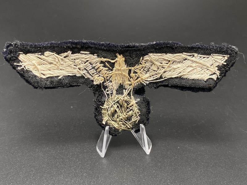 Original uniform removed German Navy breast eagle for an officer. Bullion wire on black wool backing.