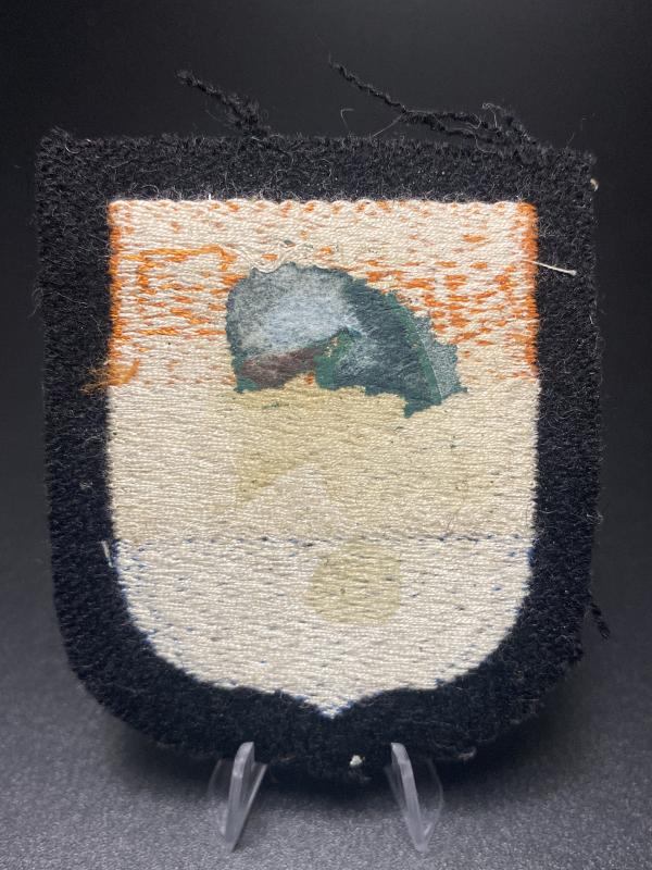 Original embroidered Waffen SS 23rd Division volunteer shield on black wool backing. In good condition. A bit of paper on the reverse where it had been attached to an album at some point. A nice example.