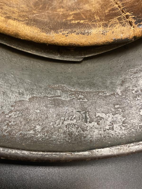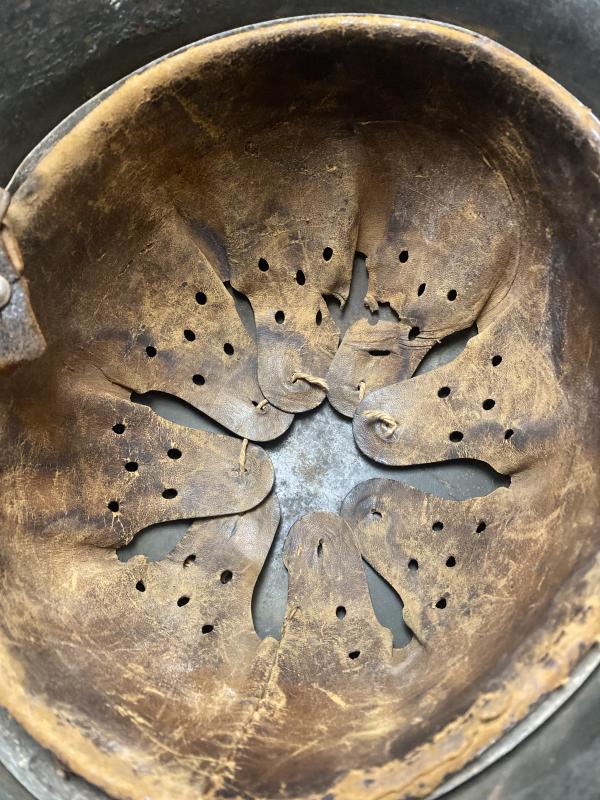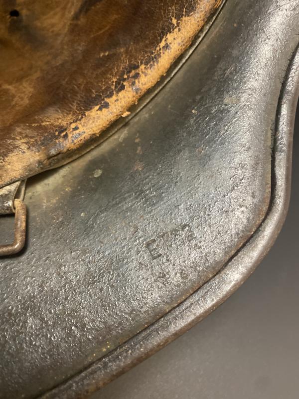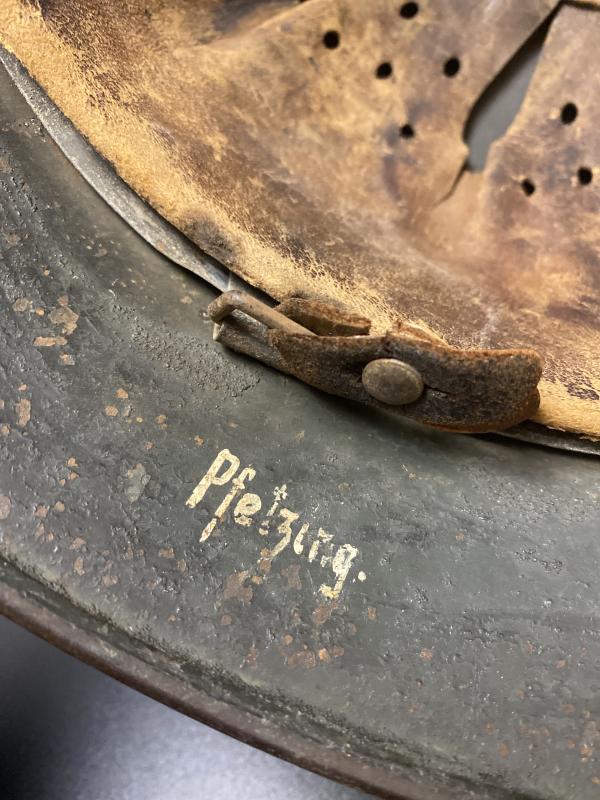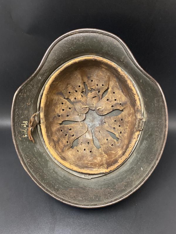 Original sleepy German army three tone M40 combat helmet with liner. Helmet displays thick dabbed three tone camouflage of green, brick red and yellow paint on the outside superb original paint that still shows through quite vibrantly despite the amount of chip, heavy wear on top where the helmet saw extensive use. Helmet is fitted with its period leather liner inside with a partial chin strap. ET62 shell with an unreadable batch number. Named to a soldier with the surname “Pfetzing” by the remains of the chinstrap overall a really nice honest camo helmet.