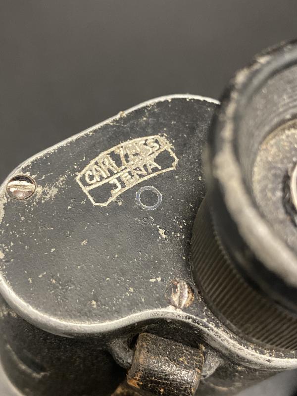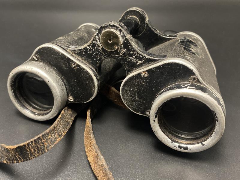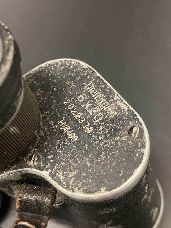 Original German army 6X30 Dienstglas field binoculars made of aluminium with Bakerlite eye caps. Complete with leather strap. Lenses clear without damage. Nice early piece.