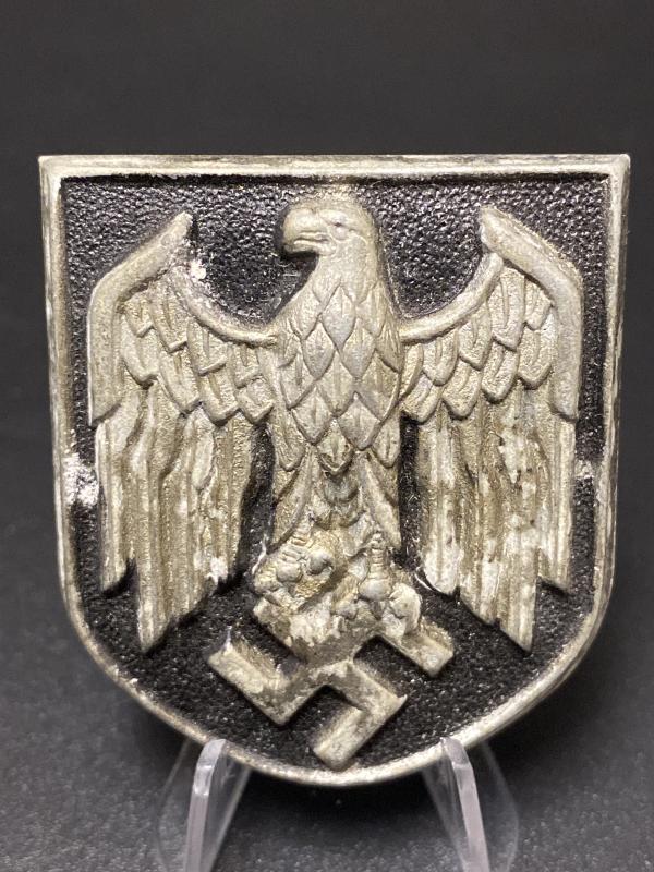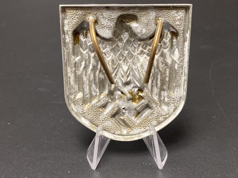 Original helmet shield for the DAK pith helmet. Two of the three prongs present on the reverse. Produced from sheet metal. A nice display piece.