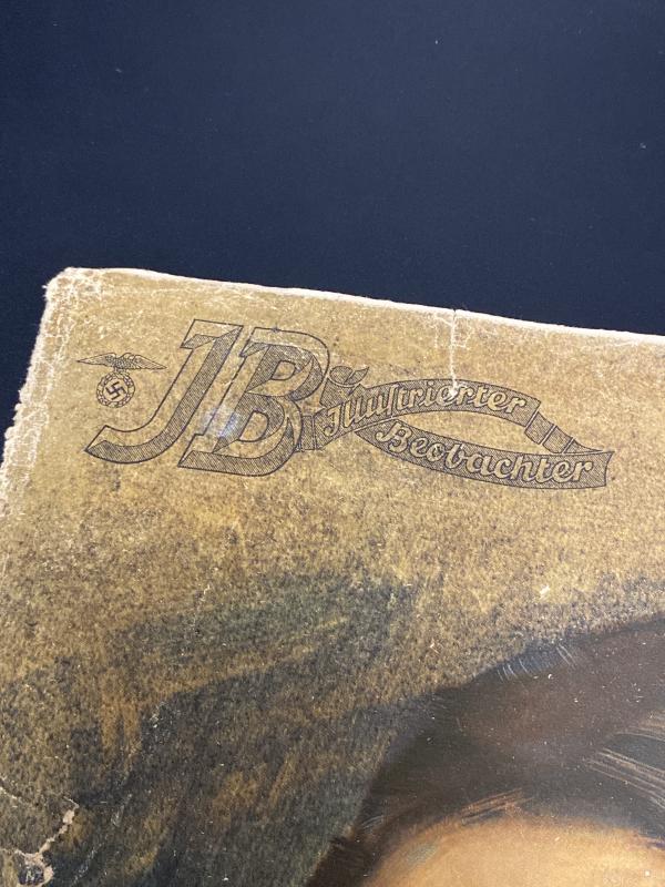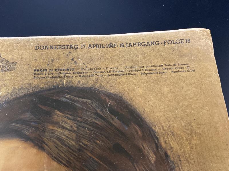 Original NSDAP party newspaper featuring a printed painting of the Fuhrer on the front. Issue 16 year 16, 17th April 1941. Several Hoffmann photos inside relating to Hitler and his involvement with the military. Central crease present, item has been folded.