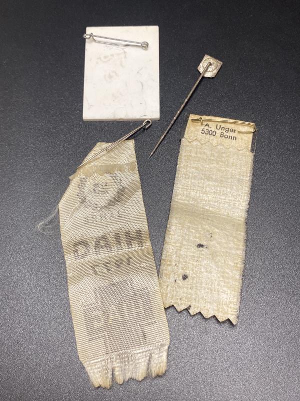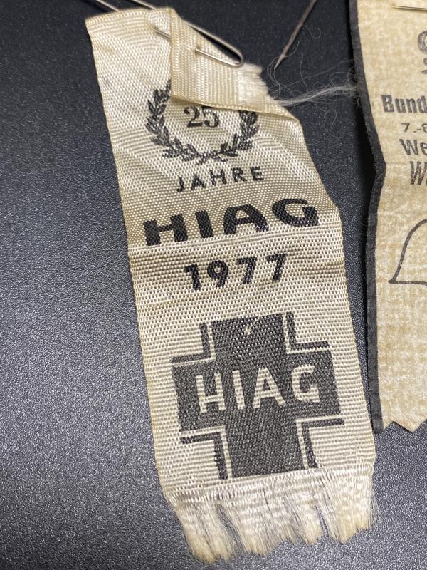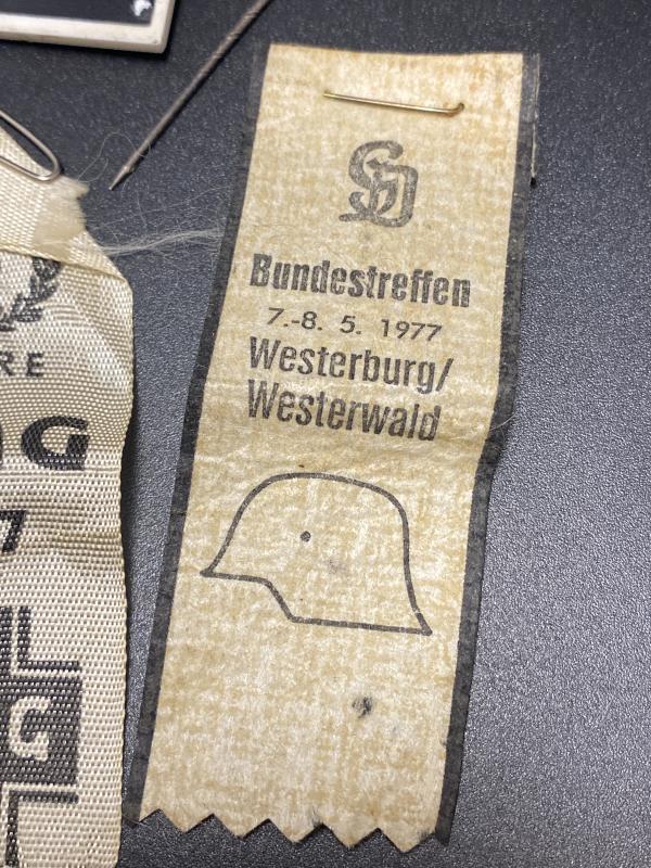 Original grouping of Großdeutschland division HIAG 25 year veterans reunion ephemera. Two ribbons, one silk and one paper, a stick pin for the HIAG and an Anti Communist front pin badge. A nice grouping all found together.