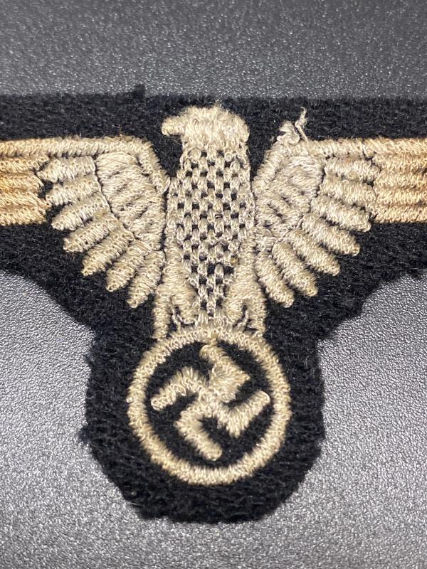 Original unissued Waffen SS sleeve eagle in “Dachau” pattern. Late war variant. White embroidery on black wool backing. Some minor staining due to poor storage.