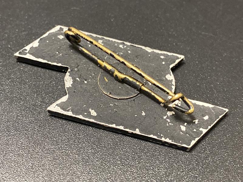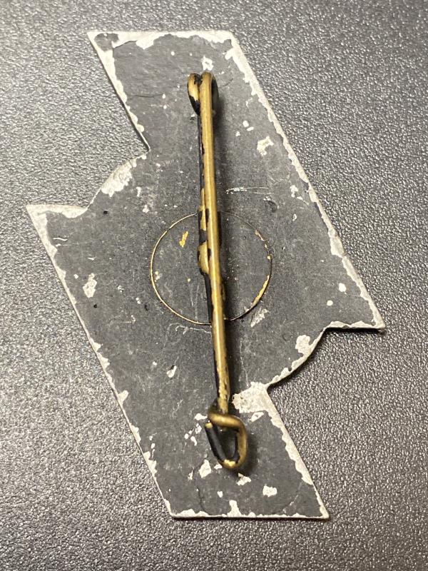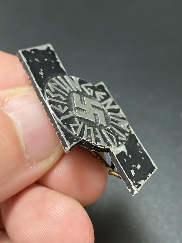 Original HJ-DJ black grade proficiency badge. Swastika with text in a wheel around it on a single Ruine. No makers mark presentx factory applied hardware on the reverse. Approx 80% of the finish remains present.