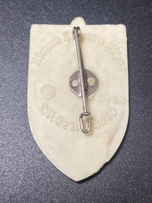 Original SA-Gruppe Niederrhein 1939 March day badge. Made of plastic with gold paint finish to the risen parts. Complete with pin on the reverse. RZM 9/25 Richard Sieper & Söhne lüdenscheid.
