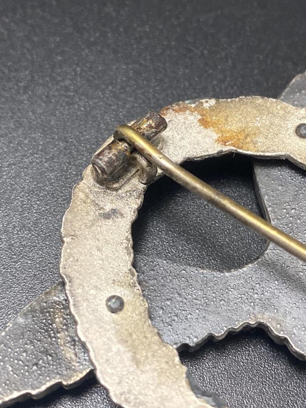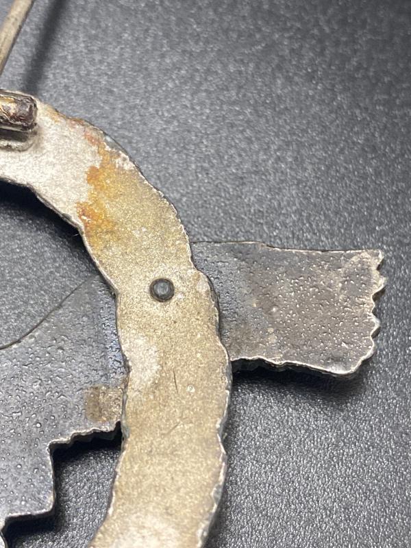 Original Luftwaffe pilots badge maker marked BSW. Nice piece with a lot of the original finish present. Two piece construction with rivet fitted eagle. Factory assembled pin, hinge and hook set up typical of this maker. A sought after badge.