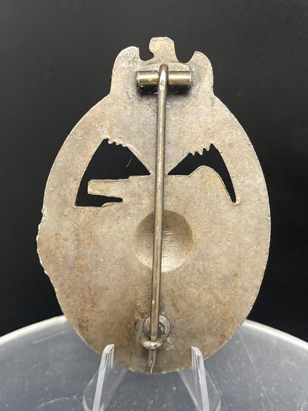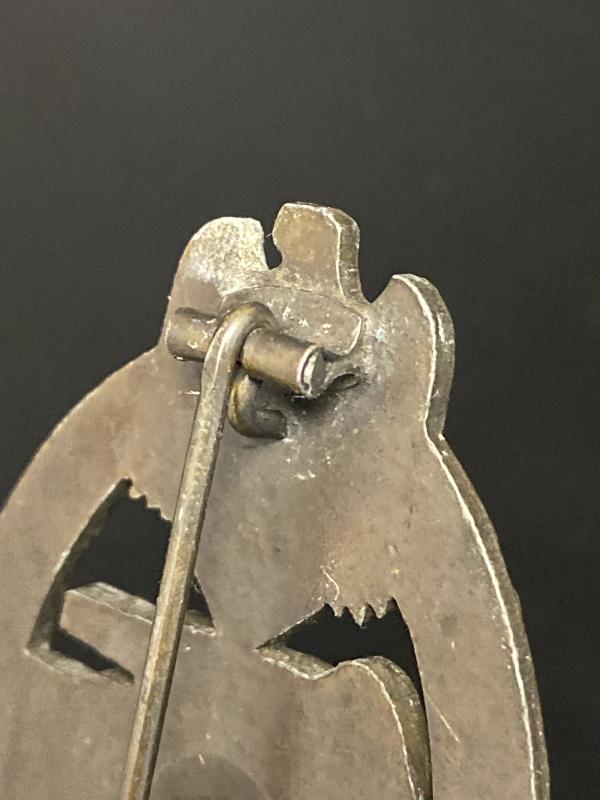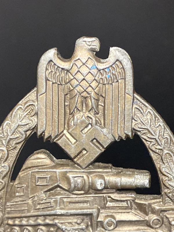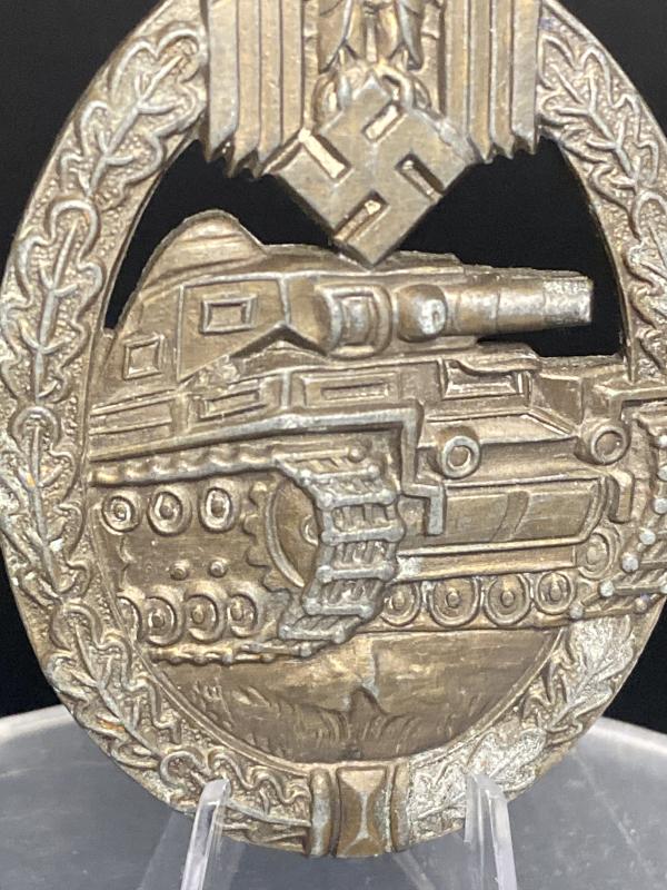 Original Bronze grade Panzer Assault Badge made by an unknown maker. Well known variant with the “Dish Back”. Complete with factory assembly hardware on the reverse. Good amount of original finish present.