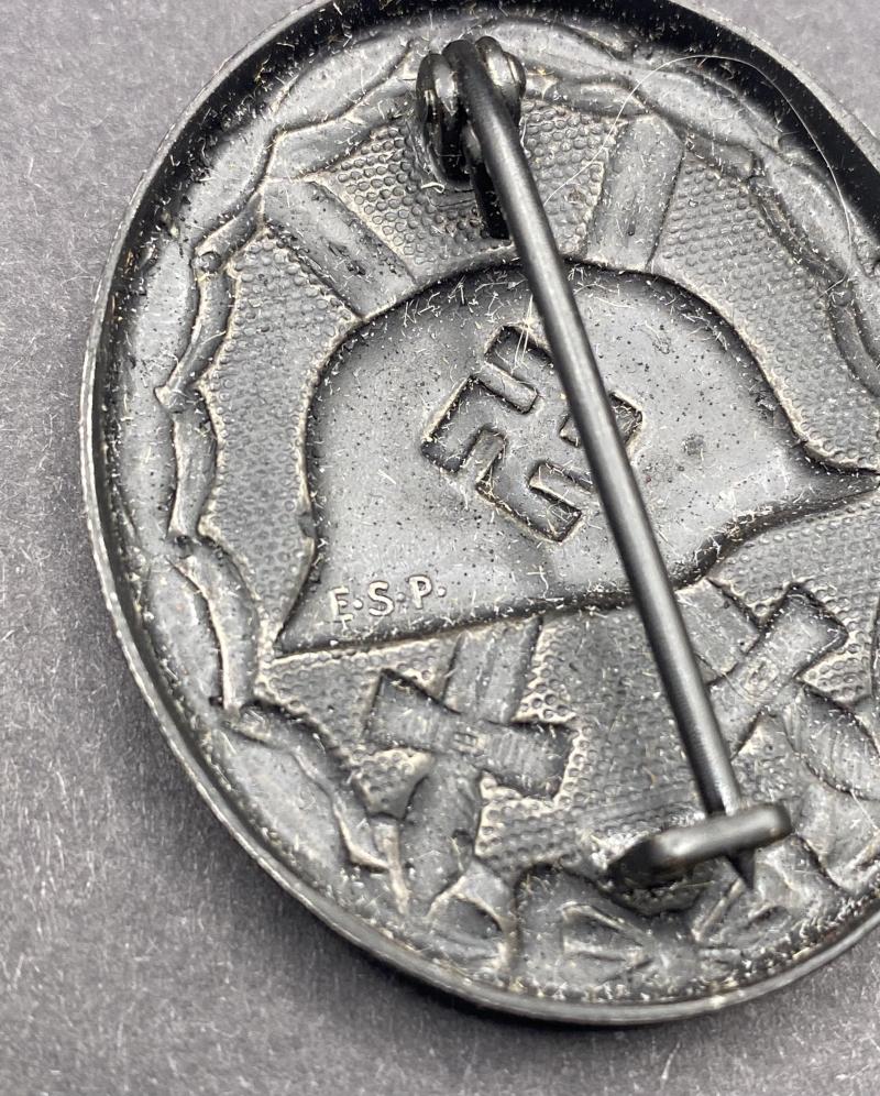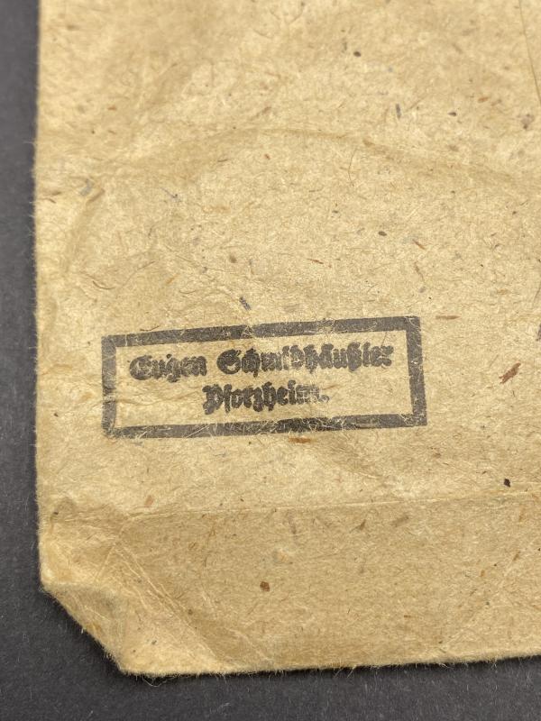 Original unissued Black grade wound badge produced by Eugen Schmidthaussler. Award complete with original paper packet. Badge marked E.S.P. Badge may have traces of paper on it due to storage. A nice item. Rarely found in the packet.