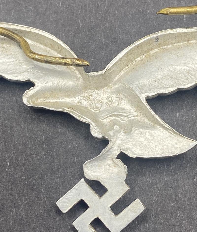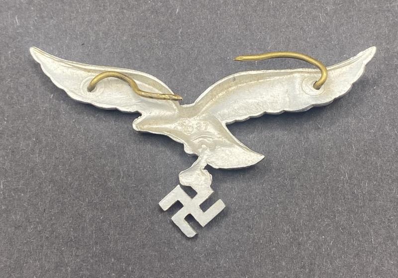 Original Luftwaffe aluminium cap eagle marked FLL for Friedrich Linden of Ludenscheid (1937). In good condition complete with pins to attach to visor cap.