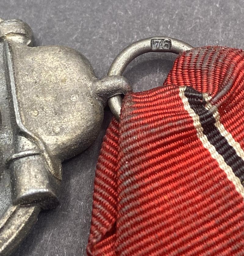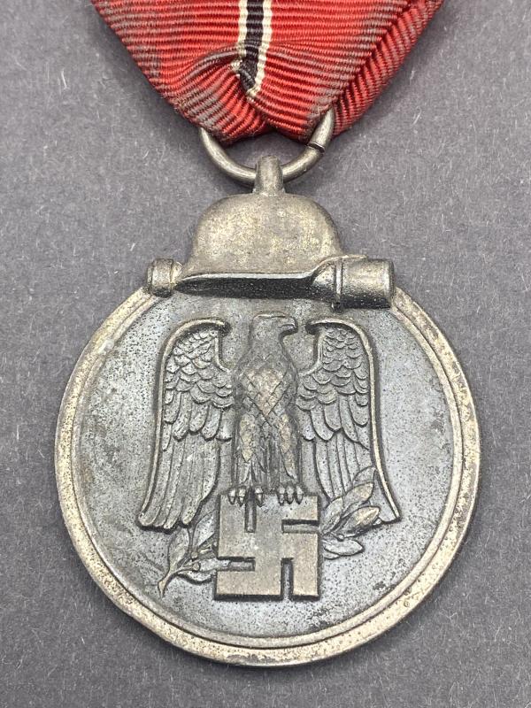 Original Eastern Front campaign medal maker marked 76 for Ernst Muller. Complete with ribbon. This example does not have any of the die flaws often encounter by this manufacturer.