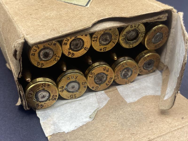 Original inert German K98K 7.92 rounds in box. Rounds all dated 1944. Complete with heads. Box has got an old repair. 15 units in total.