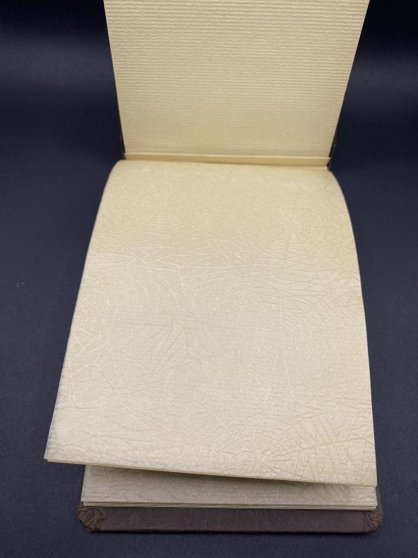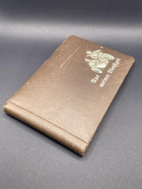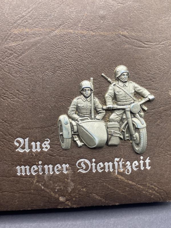 Original WW2 German army small photo album. Brown pressed paper binding mimicking leather with aluminium army motorcycle and sidecar with the embossing “Aus Meiner Dienstzeit”. Album never used.