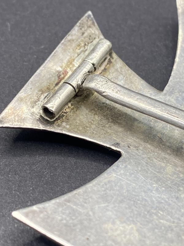 Original WW1 Iron Cross first class. Iron core with silver frame marked 800 on the pin. Barrel hinge fitting on the reverse with vaulted appearance of the cross. It appears to have had a repair on the hook at some point. A really nice issued example of a notorious award.