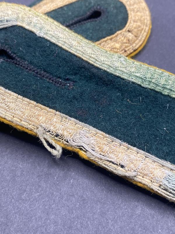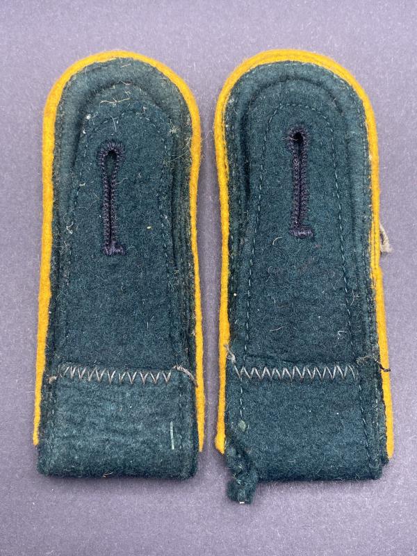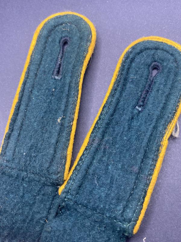 Original near set of German army Unteroffizier shoulder boards for a soldier serving in the Cavarly branch. Nice gold piping with dull coloured tresse. Some ink stains to one board. Complete with straps to attach to a uniform.